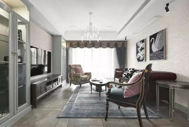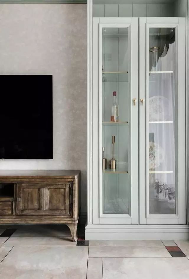 宽阔的电视墙布置旧色原木电视柜,衬托欧式古典气质,两边空出的角落设计对称的白色玻璃展柜,承担客厅收纳功能同时做藏酒用。
