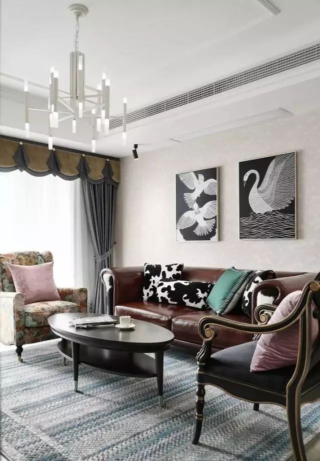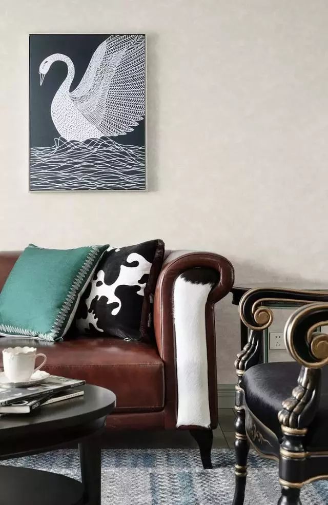 背景素雅绅士,装饰画和抱枕等成为整体装饰力亮点,颜色与背景互补,花纹繁复展现欧式风格的精致格调。