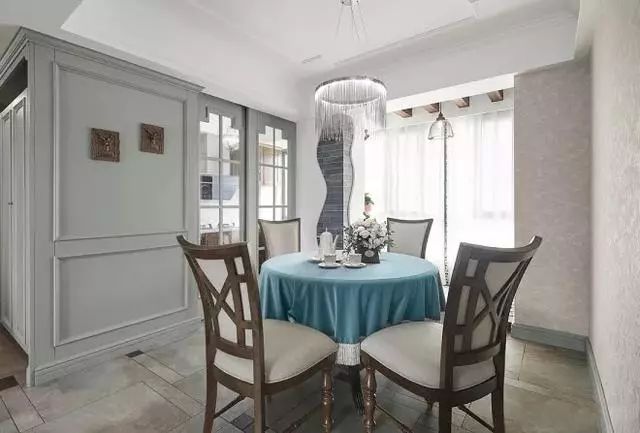 用品质高档的实木小圆桌营造浪漫舒适的用餐氛围,水波蓝餐桌布带出清新优雅,瞬间觉得在餐厅喝下午茶也很不错。