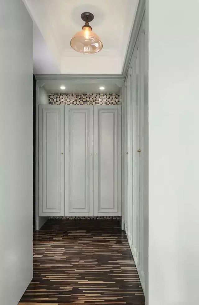狭长的小玄关做内嵌式收纳柜是最适合的,另一面墙恰好布置换鞋凳和全身镜。