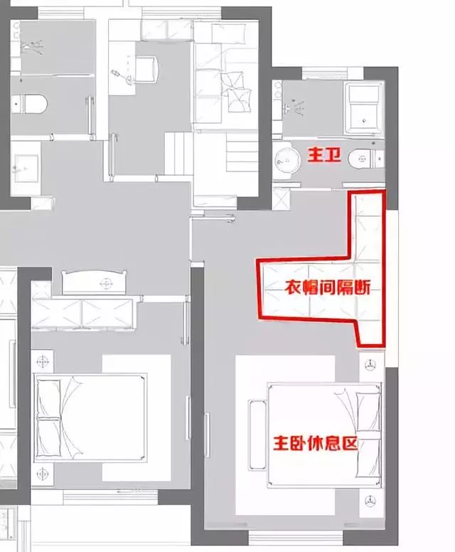 主卧室用衣帽间隔断休息区和主卫,靠近卫生间的部分收纳柜做悬空处理,以免受到卫生间水汽渗透影响。