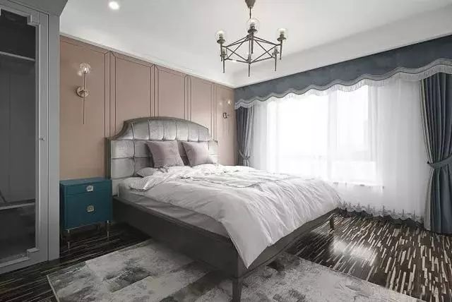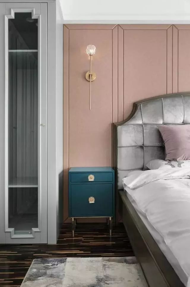 衣帽间另一边是主卧室休息区,复古蓝床头柜+肉粉色背景硬包墙,强烈撞色系对比出古典雅致,中间用银色进行过渡。
