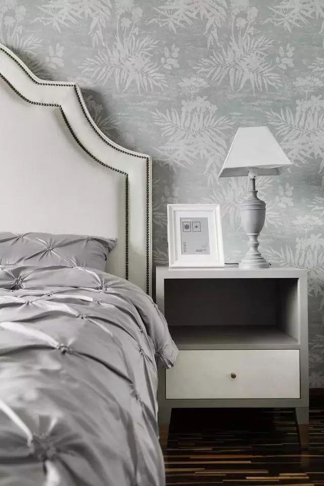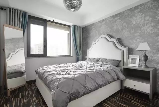次卧主打灰色的时尚感。背景墙纸选用了软装同款银色,很有整体感。自然的树叶印花总是让小编编想到松花皮蛋,吃货正在给自己加戏。