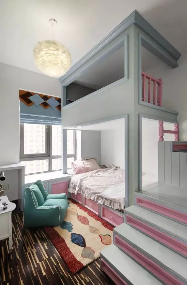 儿童房空间比较小,设计师用层高打造上下式的房间结构,下层供孩子休息上层供孩子玩耍,两全其美。