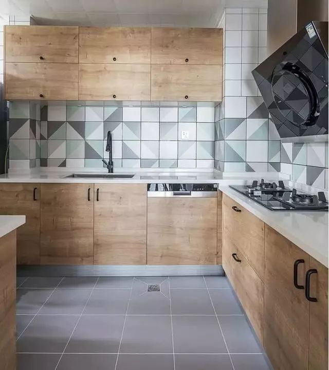 在厨房的墙面、地面铺设花砖、六边砖和仿古砖等等创意、文艺的设计,能够让厨房也变得更加清新和时尚,比起铺贴的小白砖、大理石瓷砖更加有趣。