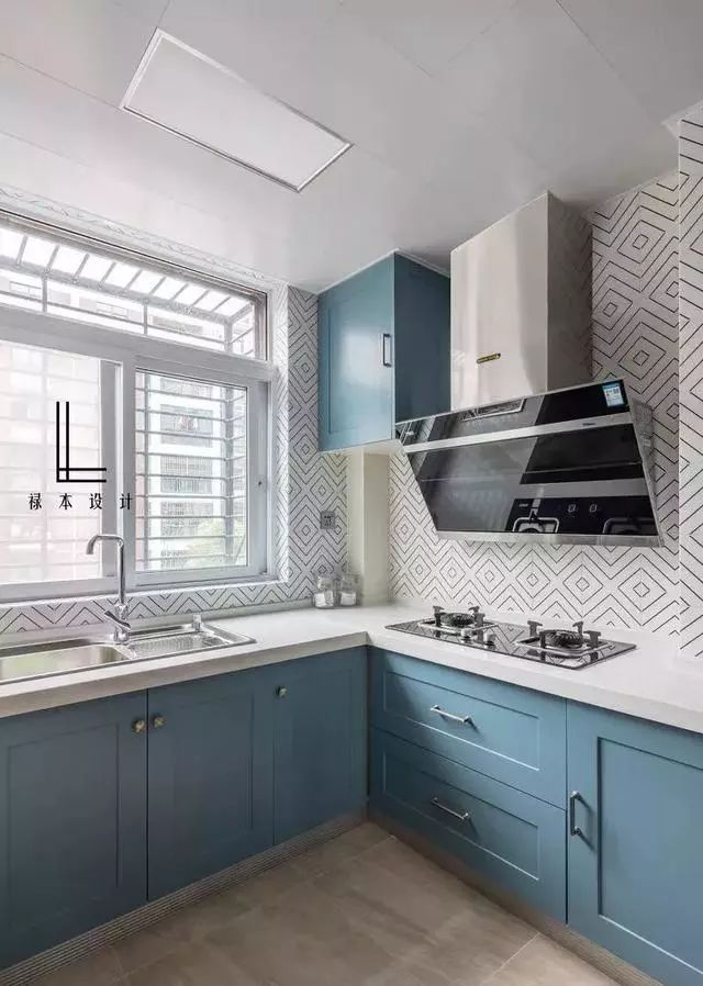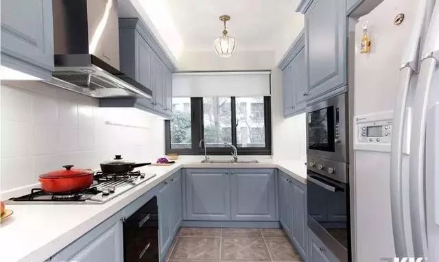 蓝色橱柜也很常见,但绝不是辣眼睛的荧光蓝,而是深蓝、蒂芙尼蓝,浅蓝,不同的蓝,演绎精彩斑斓的高颜值厨房。