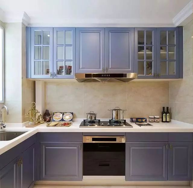 如果橱柜是深蓝色,厨房用灰、白等中性色搭配都ok。