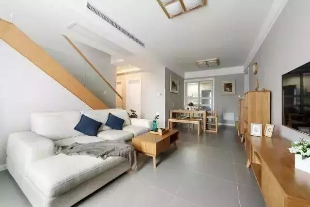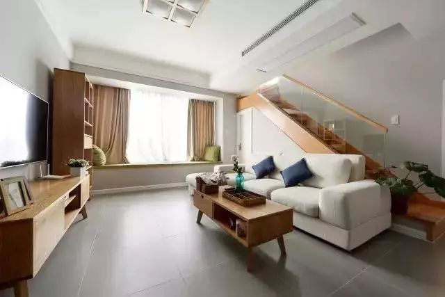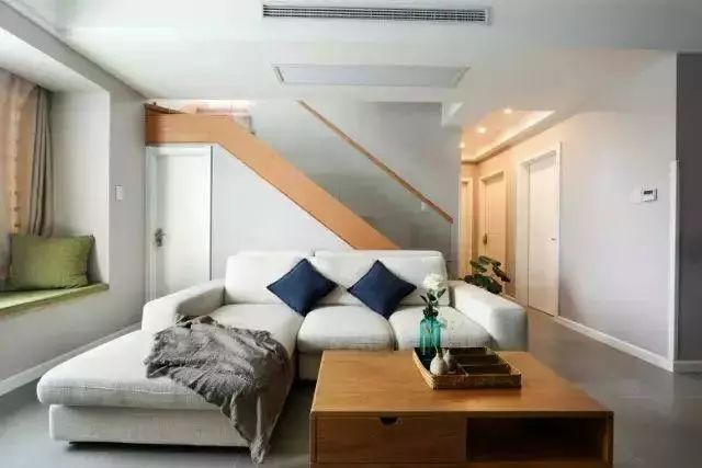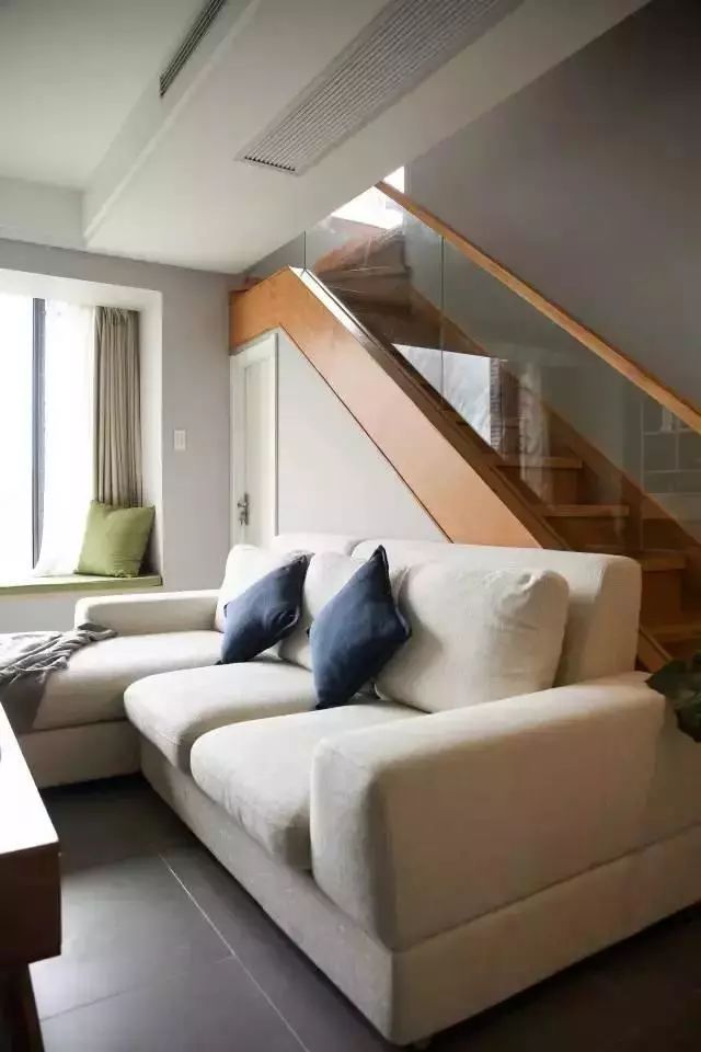 沙发背后就是通向二楼的楼梯,木色的茶几搭配上木色的楼梯,为空间增加了亮点,沙发上放着的蓝色和绿色的抱枕,显得客厅不会过于单调,空间也“活”了起来。