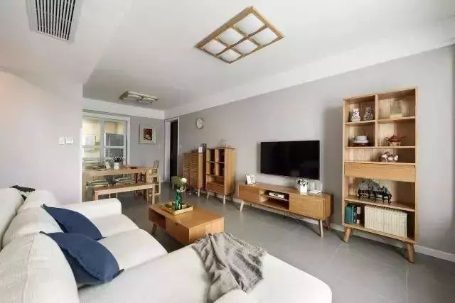 灰色的电视背景墙,除了几个原木色的收纳柜,并没有添加任何装饰,设计非常简洁,但让人感觉到很舒服。