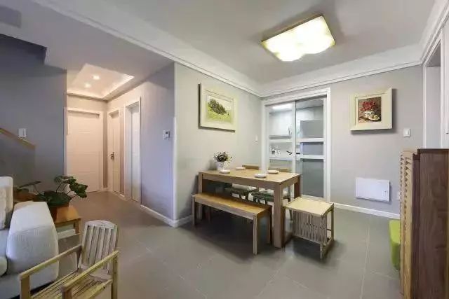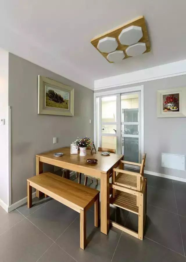 入户门正对着餐厅,考虑到开门的视觉效果,便将餐厅的桌椅靠墙摆放,从而扩大过道的空间。