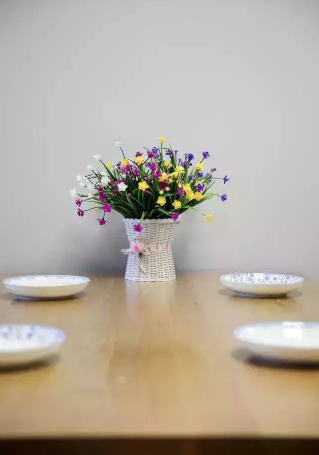 餐桌上摆放着色彩鲜艳的仿真花,给餐厅增加了不少生机与活力。