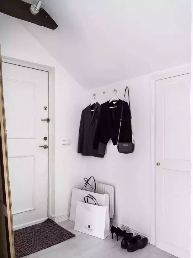 想让收纳更方便的话,就向门口的空余墙壁要空间,把衣服和包包挂在挂钩上面,满足你的多种物件收纳需求。