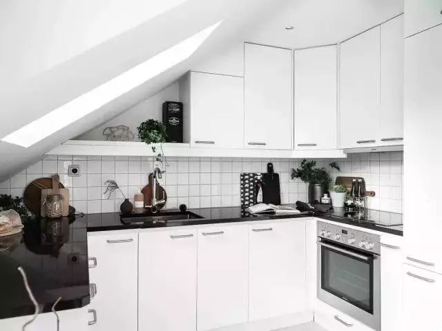 充分利用斜面吊顶的特点,塞进一套色调一致的橱柜,美观与实用一举两得。