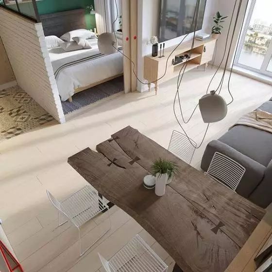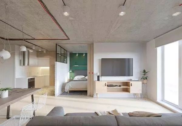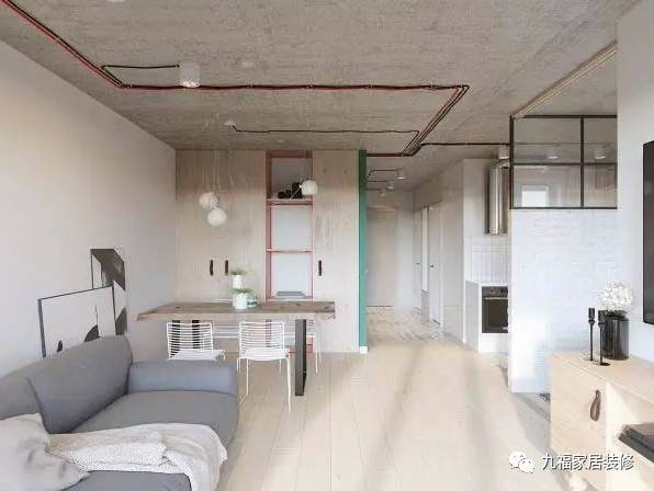 本案例是工业风小户型的设计,即便只有50几平米的空间,家居摆放、实用功能一应俱全。墙面都是用最原始的颜色来填充,墙面的水泥色将电线裸露在外,让工业风达到了最美感。