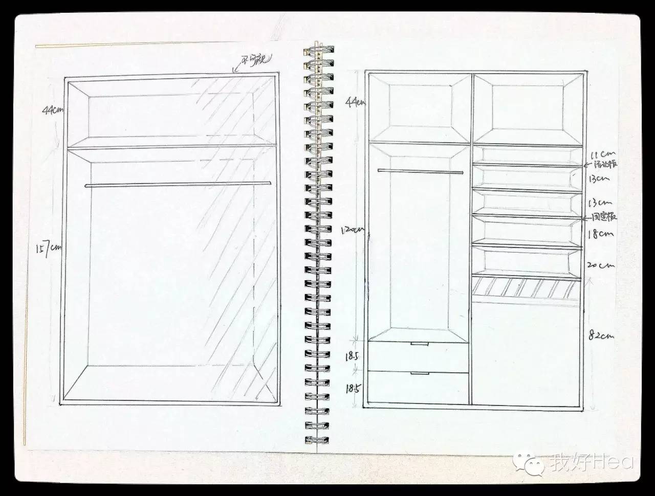 这是 hea姐画的M小姐的简易衣橱,并且测量了每个分隔的长宽高,如果你要给自己的衣橱添置合适的收纳柜或者收纳箱,这一步很重要。