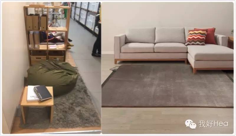 灰色的地毯哪里都可以买到,比如左边毛茸茸来自以“性冷淡”著称的MUJI,根据大小1000-2000元人民币不等。右边来自nitori(对,又是它),185*185,637元,性价比好像高很多