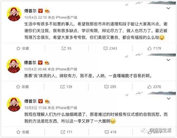 网络暴力下的傅首尔,整个十一期间的微博都充满着一股“丧”劲。