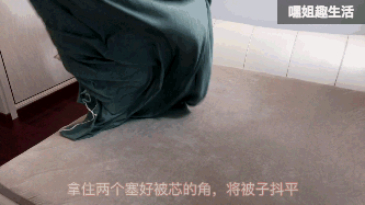 两边都找到之后,抖一抖,被子就会神奇地落进被套里,依次去套第三只角和第四只角,再抖一抖,被子已经基本套成了。