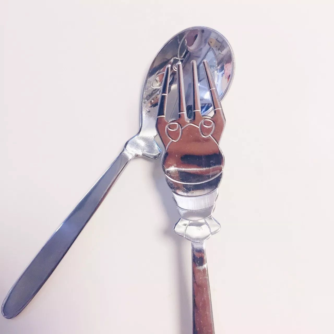 这套勺子和叉子是在冲绳水族馆买的,勺子的造型是条鲸鱼,叉子是个小龙虾,非常滑稽。