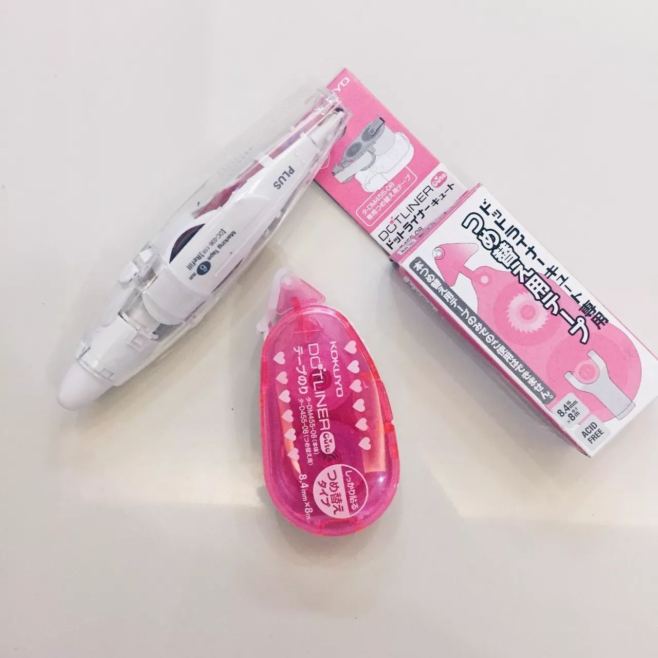 图上右边那个是个黏胶带,也做成了修正带的样子,划在白纸上是这样的,照片不够明显,其实是淡淡的粉色爱心图案。