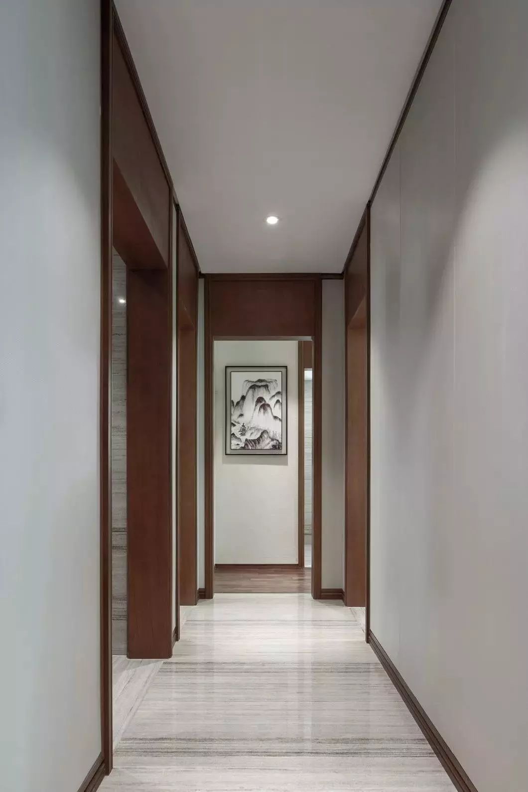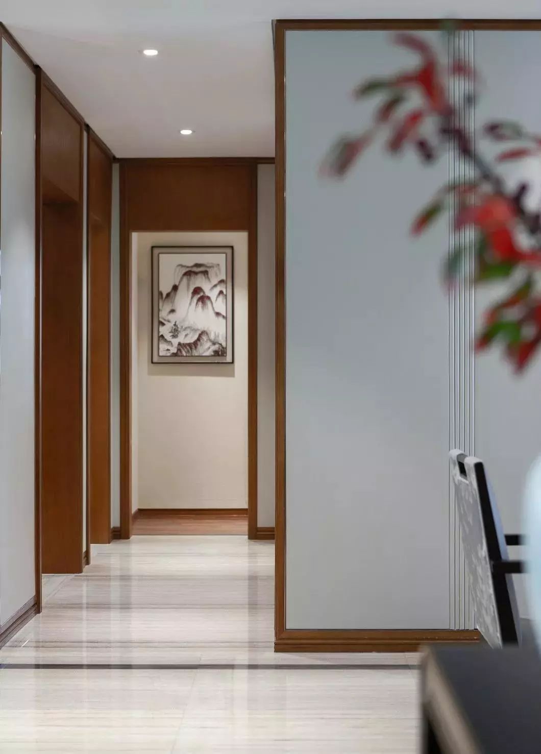 由水墨淡彩山纹硬包和木饰面装饰构成