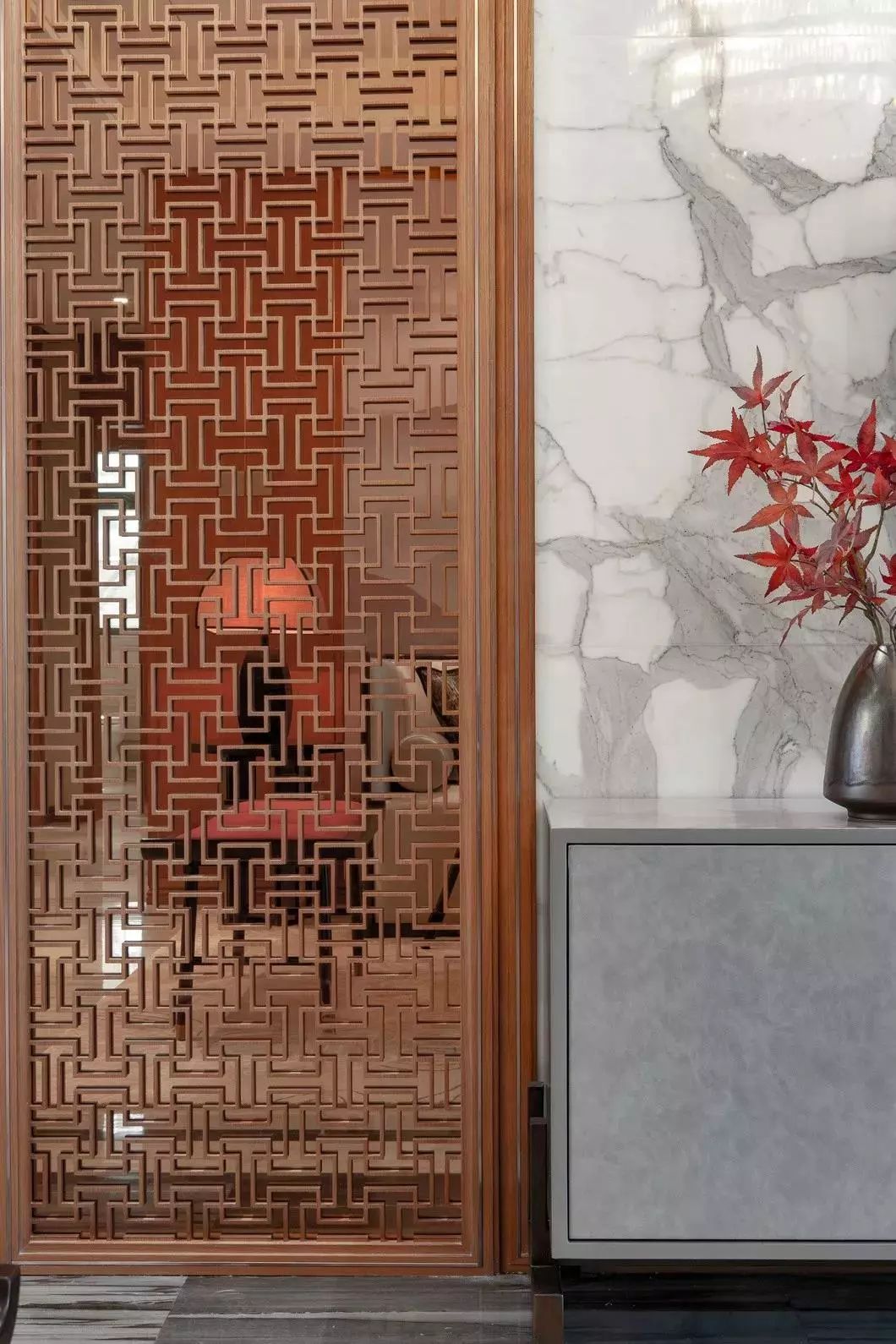 旁边伫立着木花格屏风隔断墙