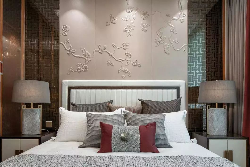 主卧床头背景中间运用花绘皮雕