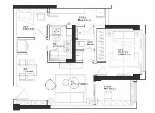 △ 紧邻客厅的就是多功能房和主卧室,原本和客厅连通的阳台通过黑色的玻璃推拉门把区域分割出了一个多功能房,即不影响采光同时双面的窗帘增加了隐私性。