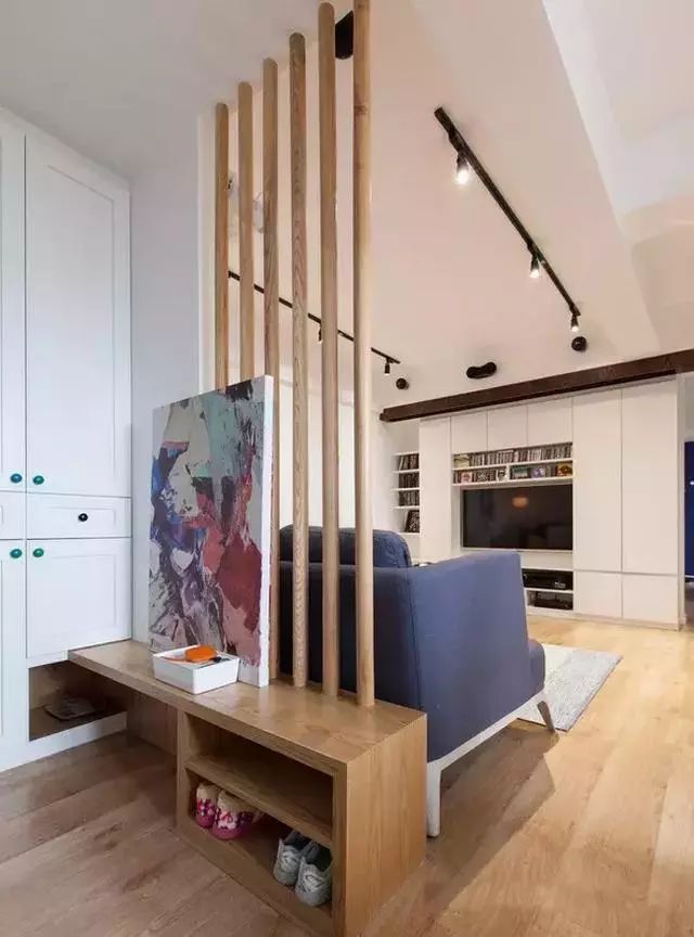 在玄关和客厅的中间加一个半墙隔断,利用换鞋凳和木栅栏作为隔断也代替了部分的沙发背景墙,非常实用、好看。