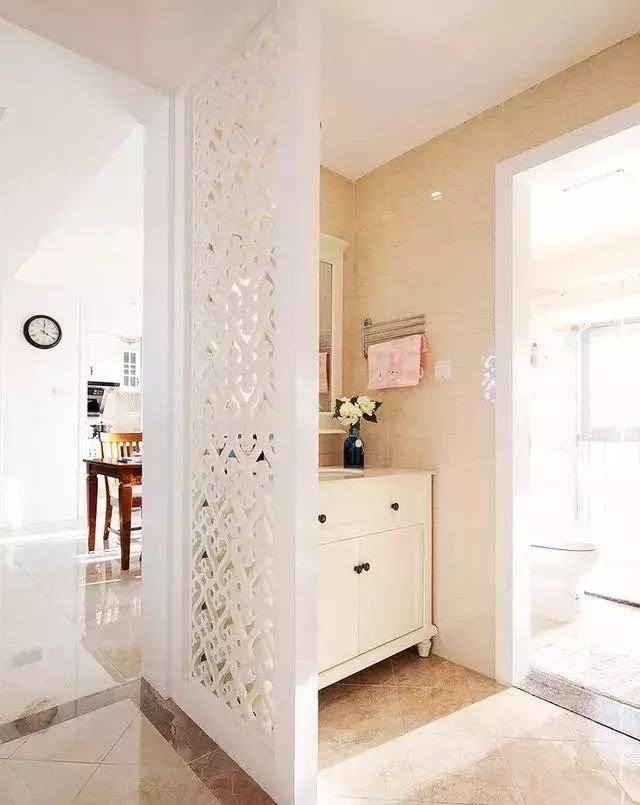 在外置洗手台的边上做个镂空的隔断,也可以避免看到卫生间门,洗手台也被隐藏在了隔断后方,更加美观。
