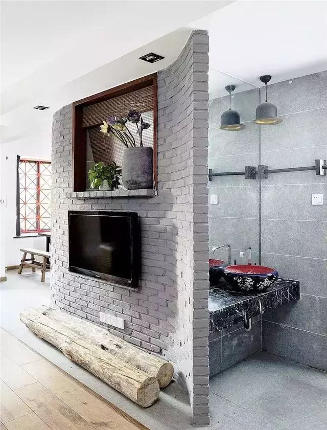 电视背景墙也可以成为创意的隔断,弧形的砖墙和背后的洗手台也非常的搭,让人感觉你家也会更有高级感。