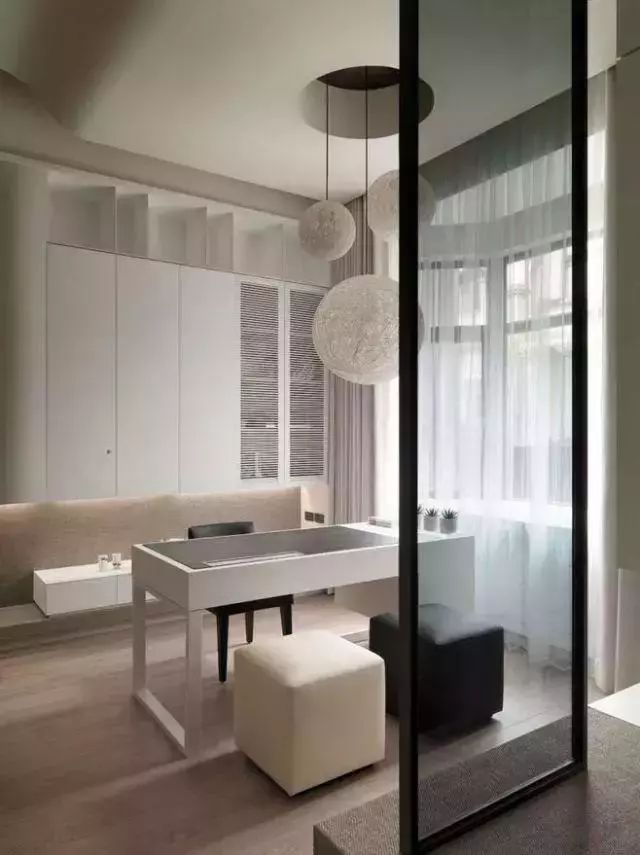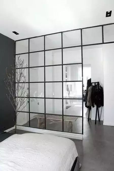 很多单身公寓都会选择用玻璃作为卧室的隔断,如果觉得隐私性不够的话,就可以加上窗帘或者换成磨砂玻璃。