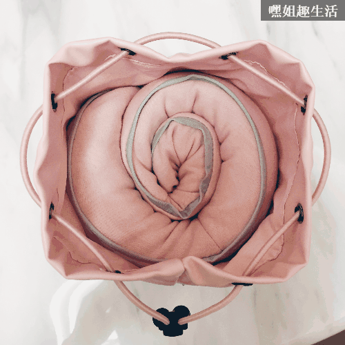 还有一个贴心的细节,就是颈枕两头装有两根抽绳和帽衫锁扣,可以锁住向上拉紧,好像穿衣服一样,像我这种小头妹子就不用担心颈枕太大架不起来了。