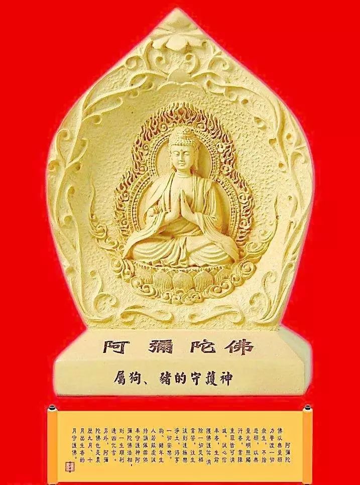 【属狗、猪:阿弥陀佛】阿弥陀佛代表光明无量,寿命无量,能够默默守护狗年和猪年出生的人,通天智慧,摆脱烦恼,不疲不倦,与社会与家庭共创人生佛业。