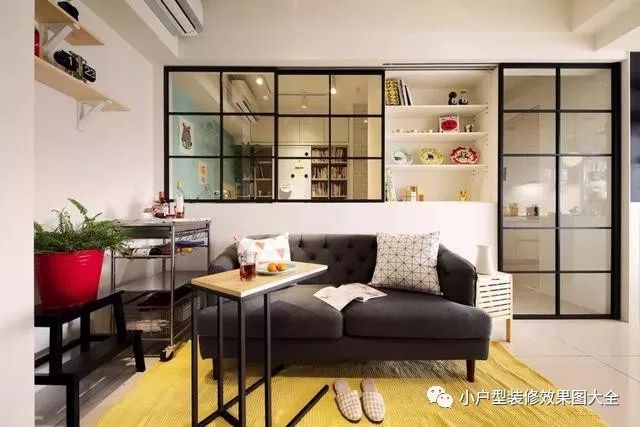 深灰色沙发和黄色的地毯,后方是镶黑边的透明玻璃的窗户和推拉门,这样的设计增加了空间的宽敞度。客厅之中没有设计什么的大型的吊顶,而是在吊顶上方围绕了一圈装饰灯,文艺有节省装修成本。