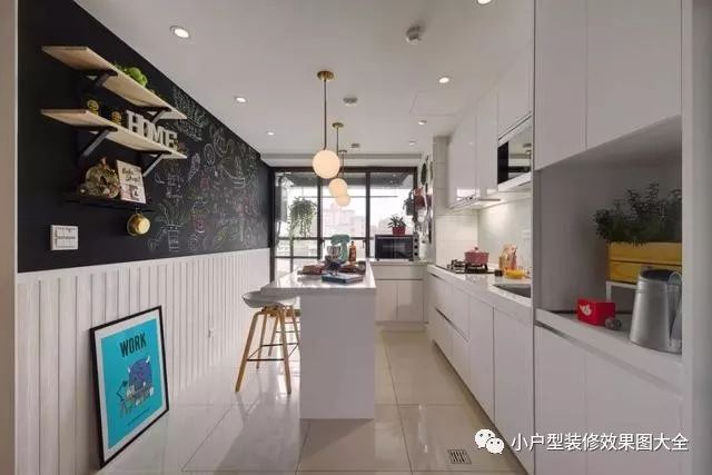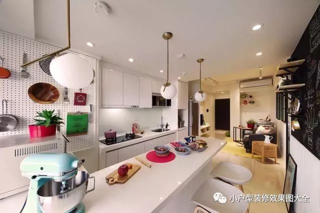 开放式的厨房,外侧是吧台样式的餐桌,上下双层的橱柜设计,中间开辟的空间正好就是烹饪区,旁边的白色墙壁是一面悬挂墙,用来挂厨房用具。