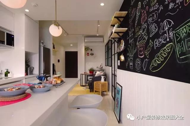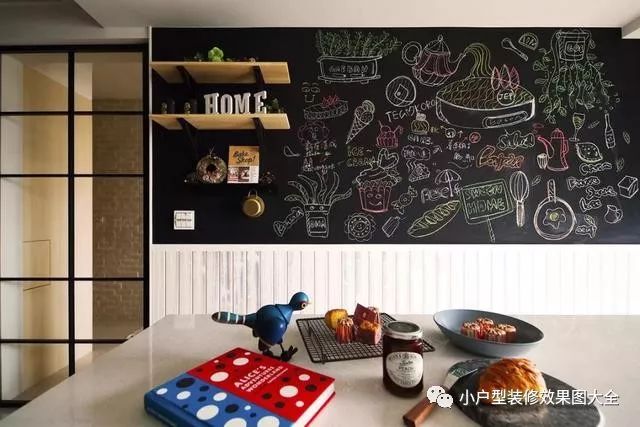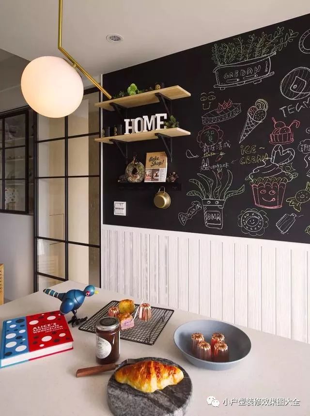 餐厅和厨房是结合在一起的,后方是黑白色搭配的墙壁,上方是一面黑板,下方是条形的半面墙壁,清新简约。