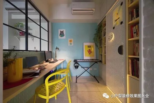 书房的设计在用色上很是清新可爱,蓝色和黄色的搭配,双人座的设计,让整个书房有种岁月静好的温馨感。