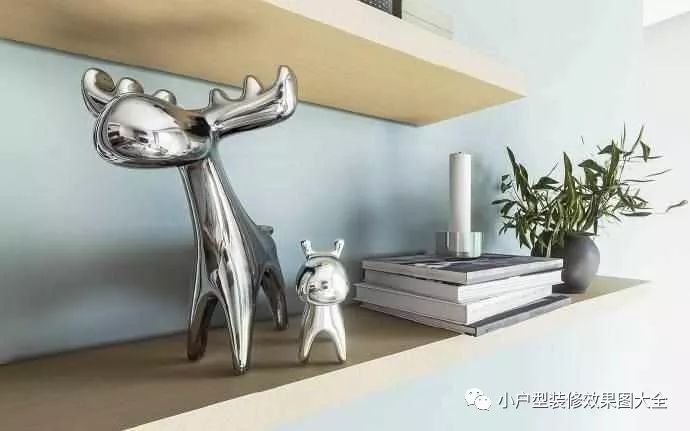 沙发背景墙是单独砌出来的一面墙,背景墙上用了一幅画和两格简单的而悬空展示架装饰。