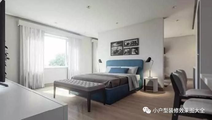 客厅沙发背景墙的后方就是我是,以前之隔,背向相驰的设计,蓝色的布艺床,床头呈对称的设计,书房和梳妆台合二为一。