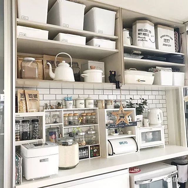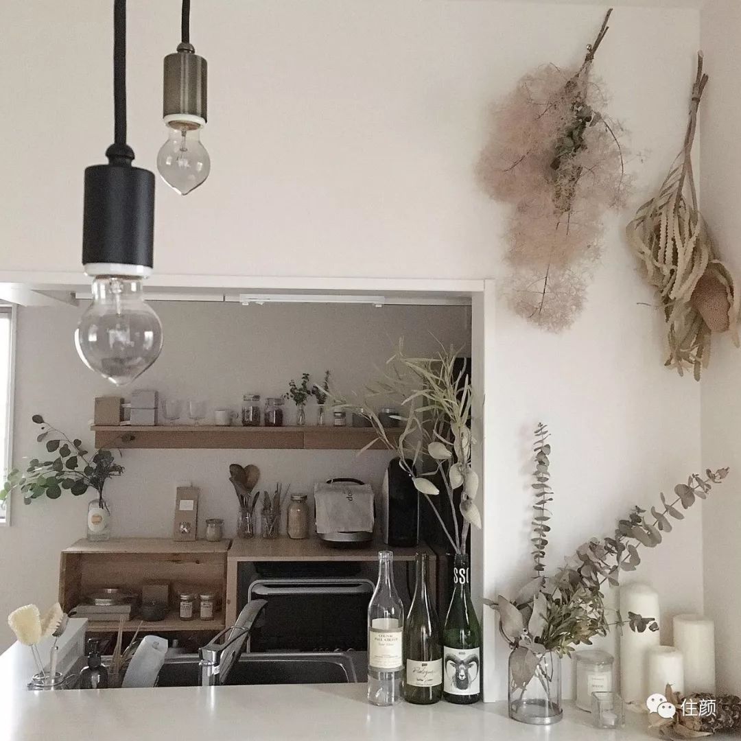 墙壁两边的隔板放置了一些不经常用的物品,保证了台面的整洁,淡而又淡,简而又简,也是盐系的关键要素,如隔板上的储物再精减一些,会更好。