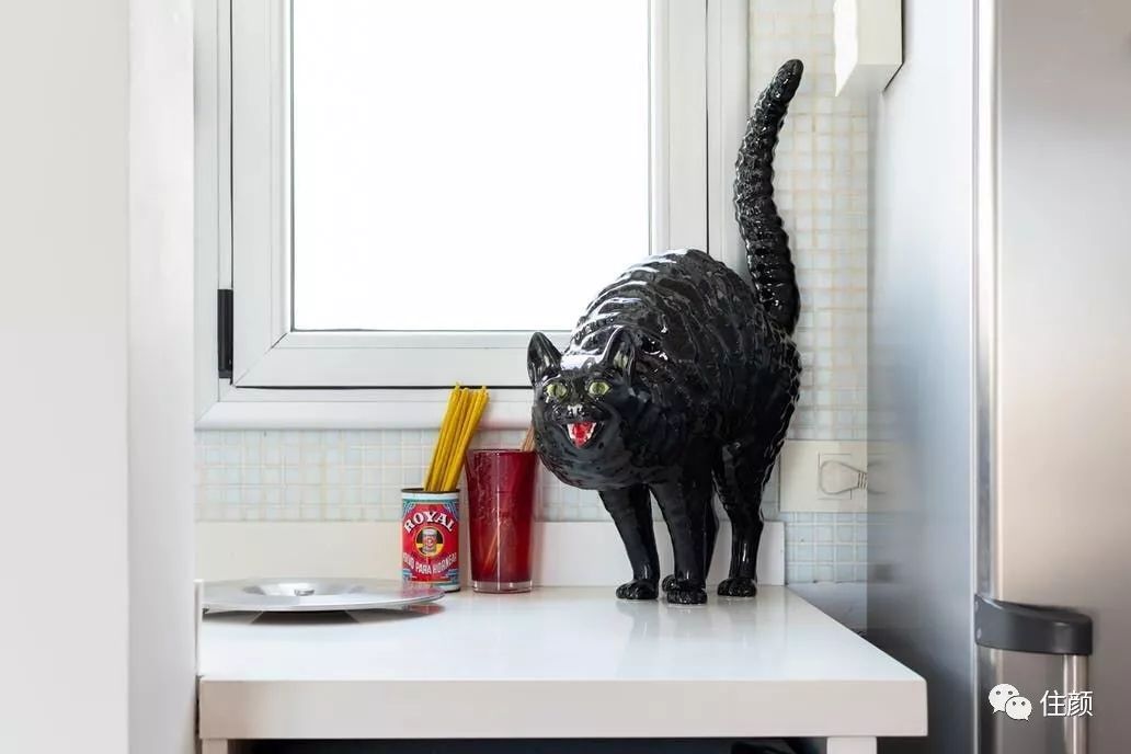虽说黑白灰的配色是盐系的标准色系,但是和性冷淡风还是有区别的,Hernan平日里非常喜欢收藏,这只黑猫是一位葡萄牙艺术家的陶瓷作品,可是给空间增色不少。