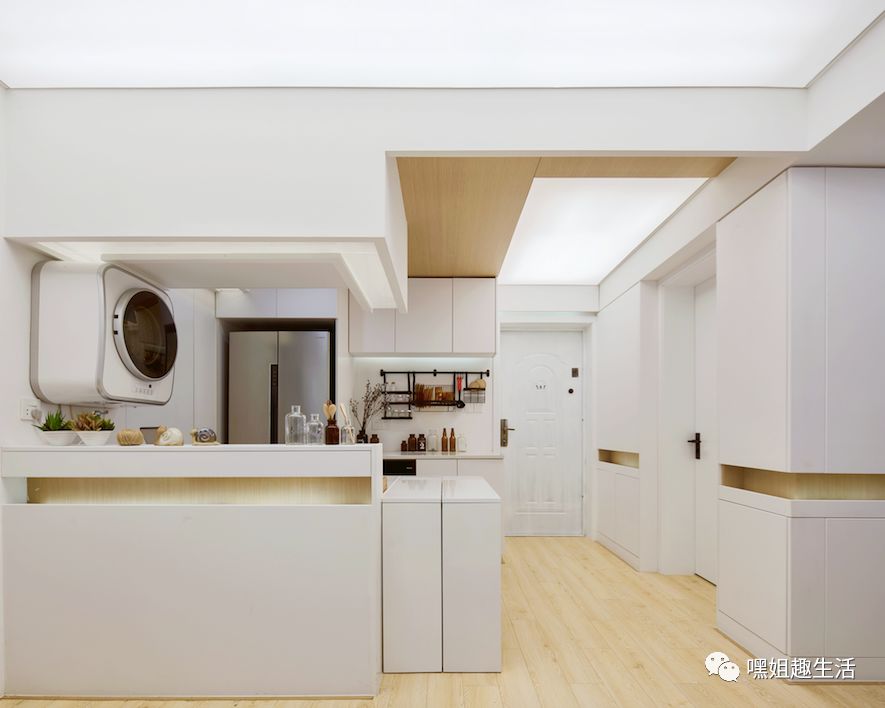 客厅打造了一个西式厨房,设计师说这么做是为了方便妈妈冲泡奶粉也能随时照看宝宝。
