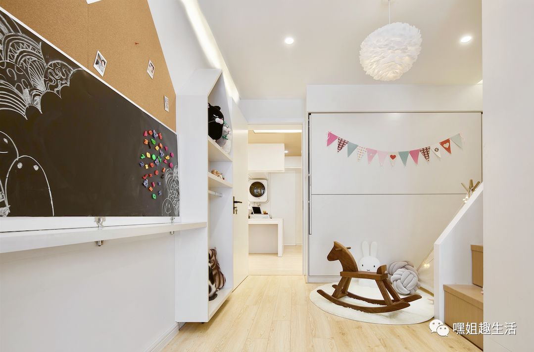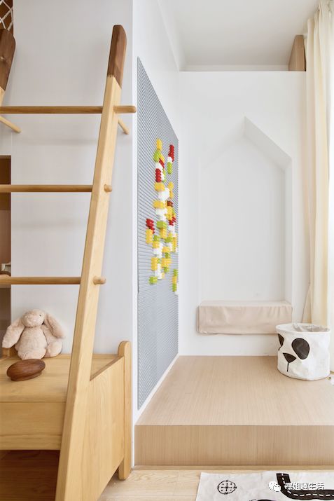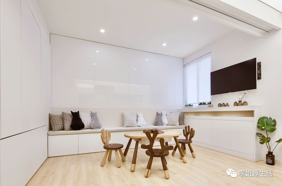 客厅区域白天的主要功能就是给孩子玩耍,靠墙有一排排凳。