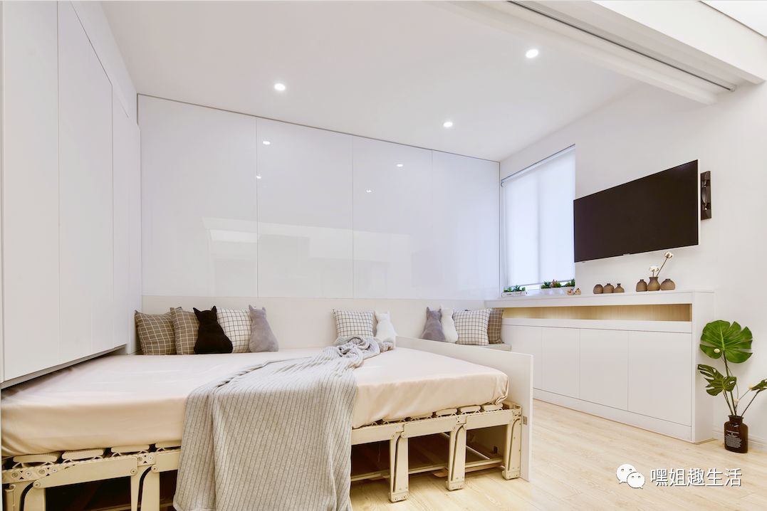 而房间的一侧墙面,竟然藏着一张可以折叠的双人床!