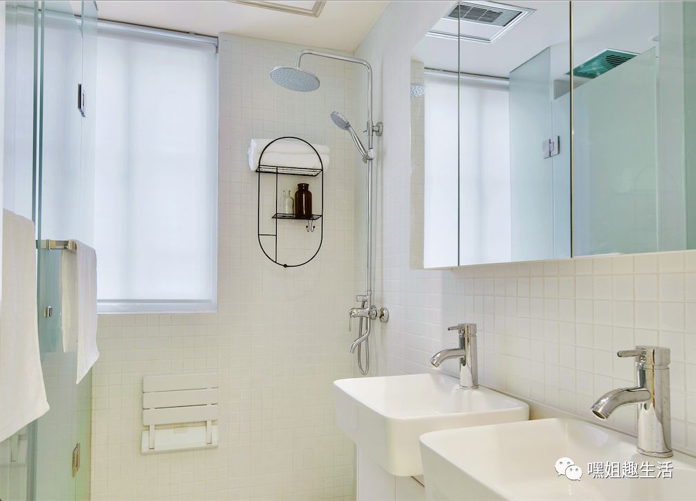 设计师跑遍了建材市场,才找到了这么小的双台盆,另一边也特别设置了两个独立马桶。