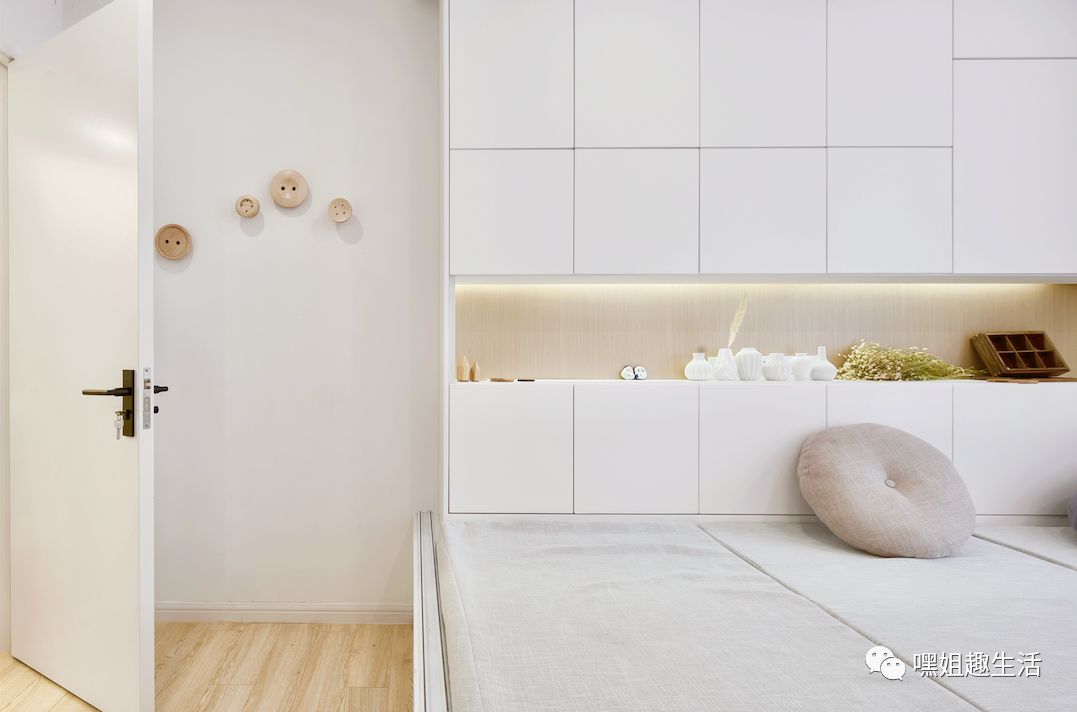 主卧用了榻榻米的设计,一方面双胞胎宝宝目前还需要和爸爸妈妈一起睡觉,另一方面也增加了海量的储存空间。
