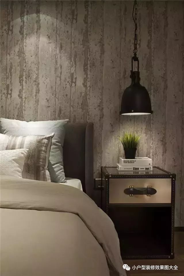灰色的仿木花纹的床头背景墙,灯光的映衬,带有工业风元素的小装饰品,还有一张大大的双人床,有种时尚帅气范儿。