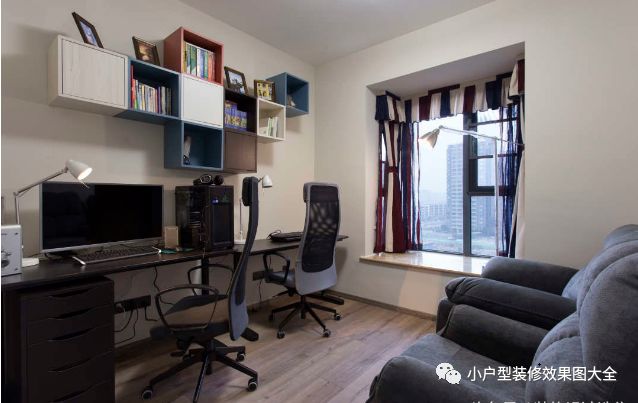 再来就是书房了,既然是小小的二居室,另一个居室是可以自由选择的,如果不想装修成侧卧当然是可以像这样装修成书房的,小小的书房虽然面积不大,但是摆上电脑,后面配上舒适的两个沙发,闲暇之余,可以玩玩电脑,或者是躺在沙发上看看景,晒晒太阳。墙上的一些小书柜既可以放书节省空间,也是的墙上不会太过空旷。