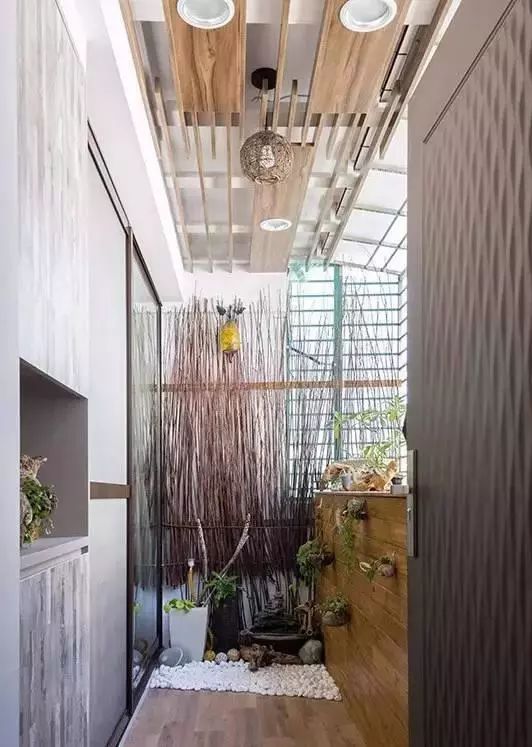 玄关处,系统柜+木板打造栅格吊顶,对应着下方绿植以及小石子打造的自然元素,让这里显得像一处原始清新的花园。